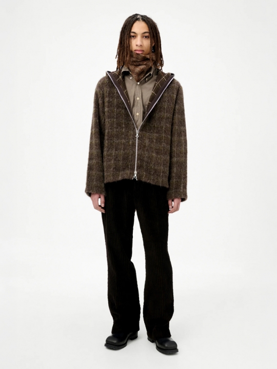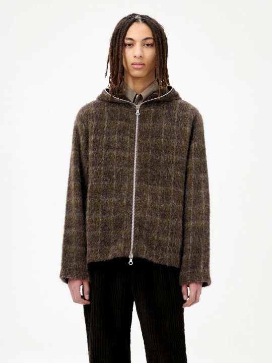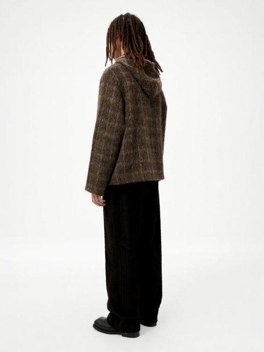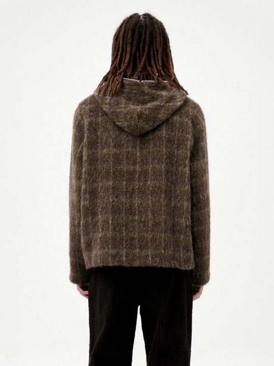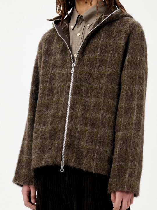 深咖啡格子連帽羊毛外套
