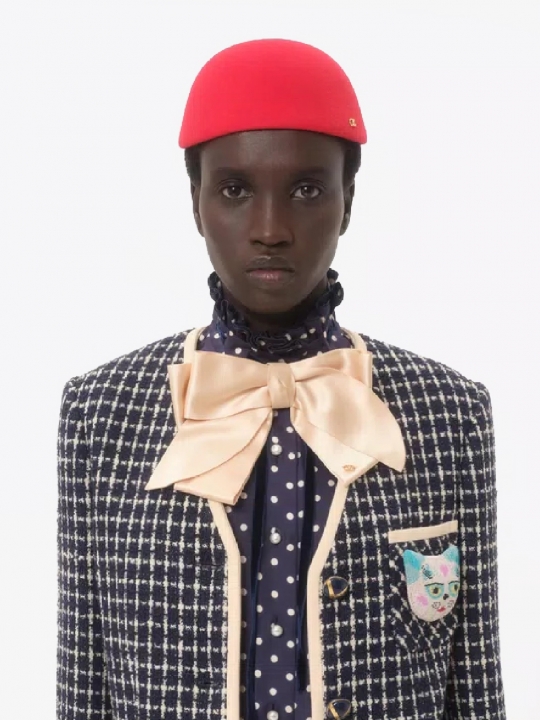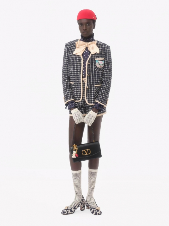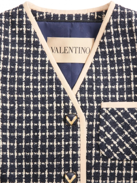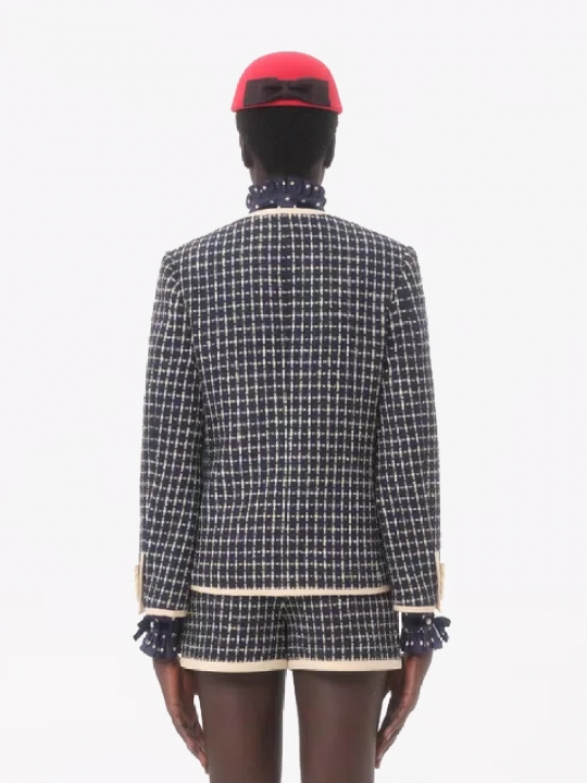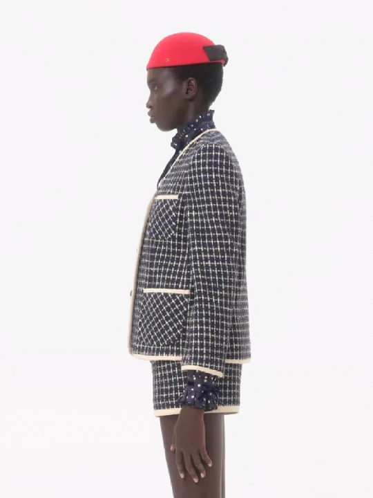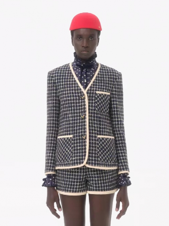 珠皮呢夾克,搭配撞色縐紗 Couture 細節。 模特兒身高176公分,穿著40號