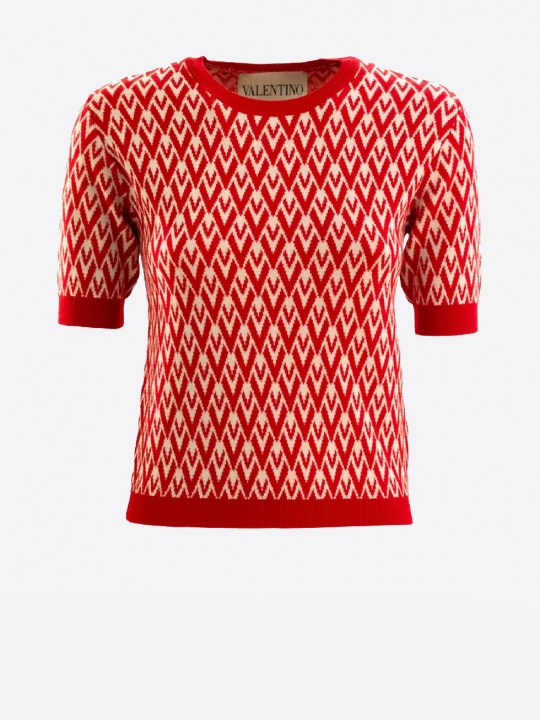 紅色幾何短袖針織上衣