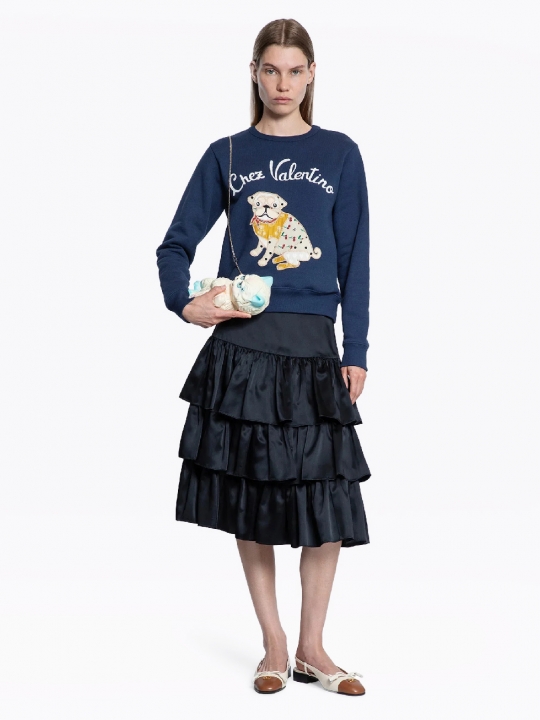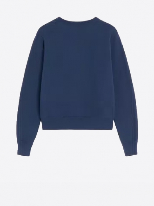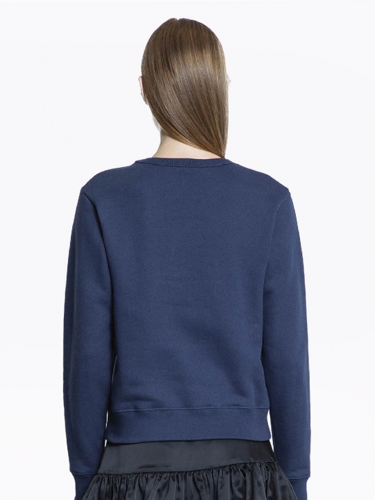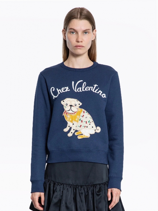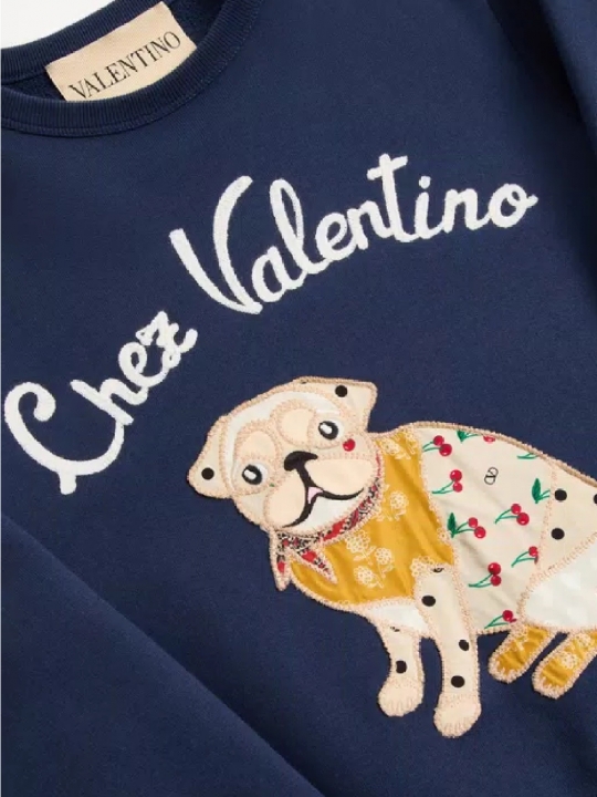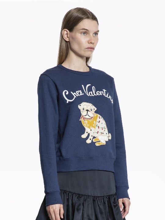 純靛藍色純棉衛衣,正面白色撞色logo,搭配顏色拼接狗狗圖案,羅紋袖口和直筒下擺。