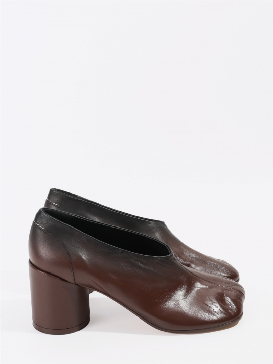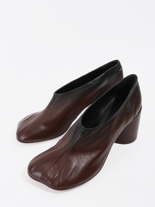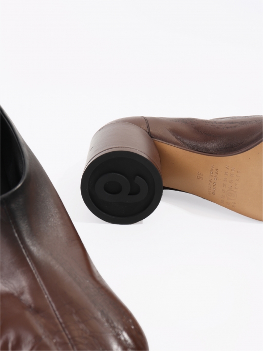 這款黑色/貂皮色皮鞋採用真皮材質,表面經漸層處理並帶有龜裂紋理。鞋頭採用符合人體工學的包頭設計,貼合腳趾輪廓;鞋底配有標誌性的圓柱形鞋跟;鞋跟飾片上飾有傳統的MM6縫線。