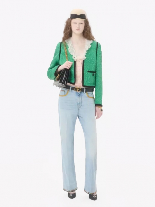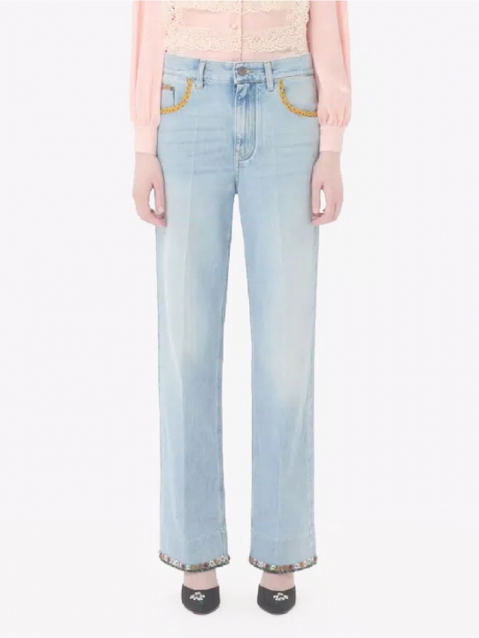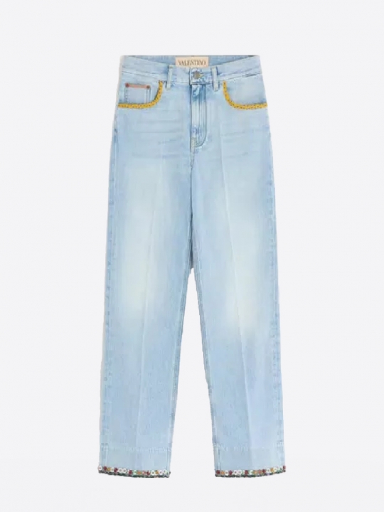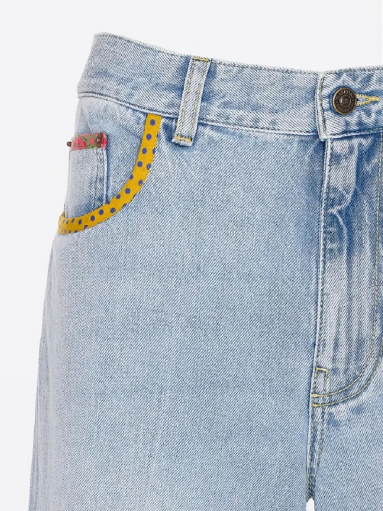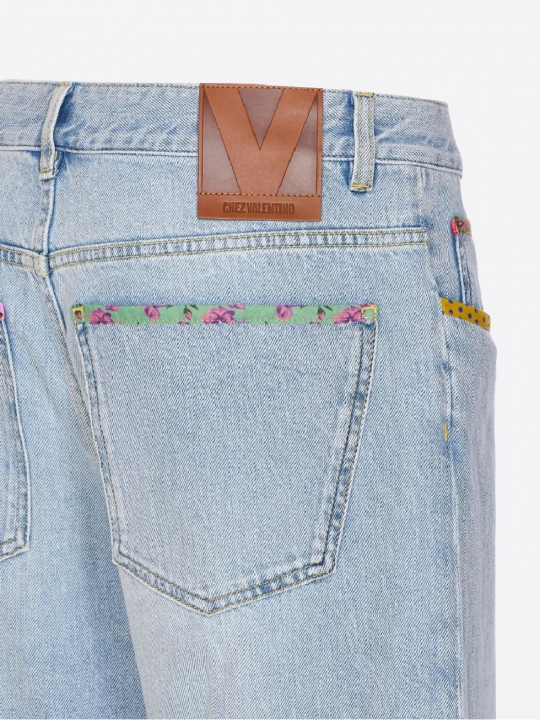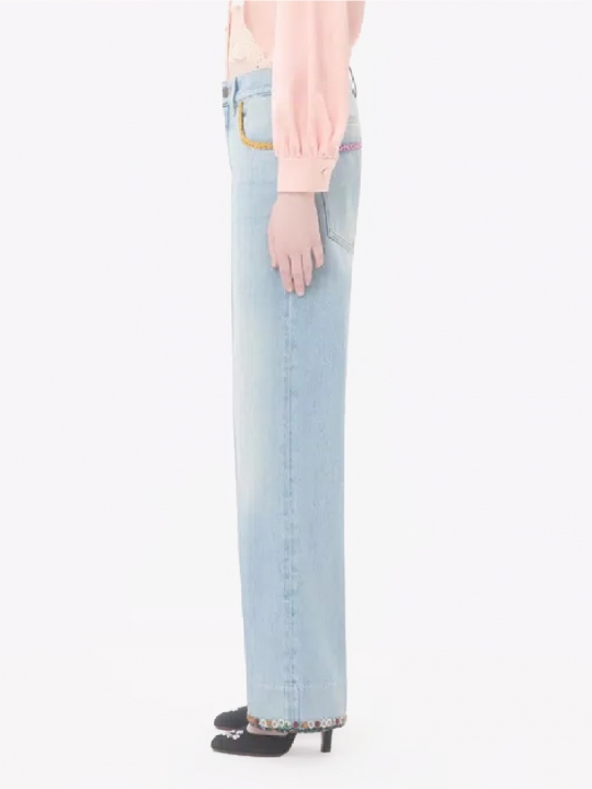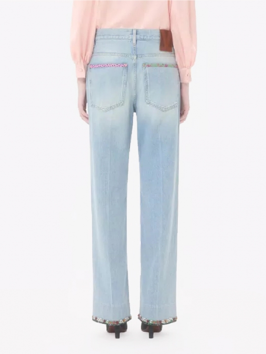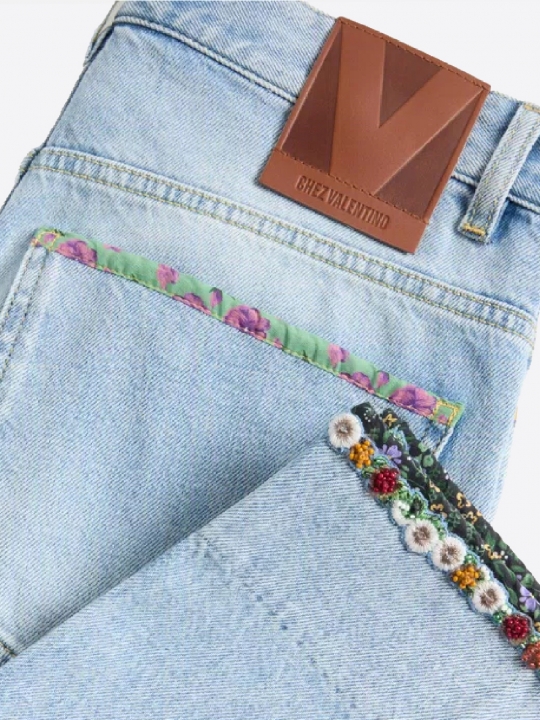 採用純棉牛仔布製成的牛仔褲,褲邊飾有獨特的補丁。 模特兒身高176公分,穿著40號