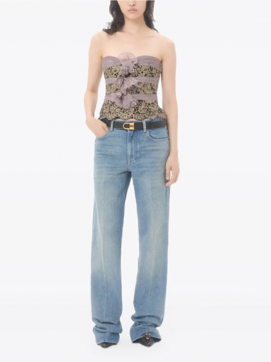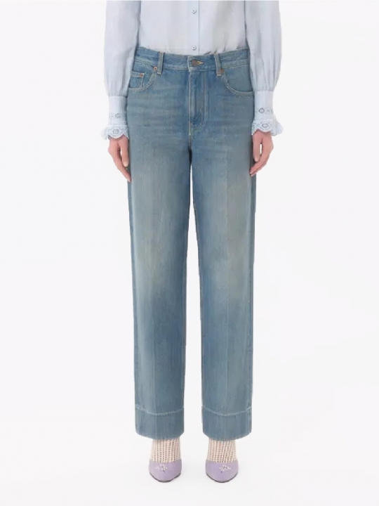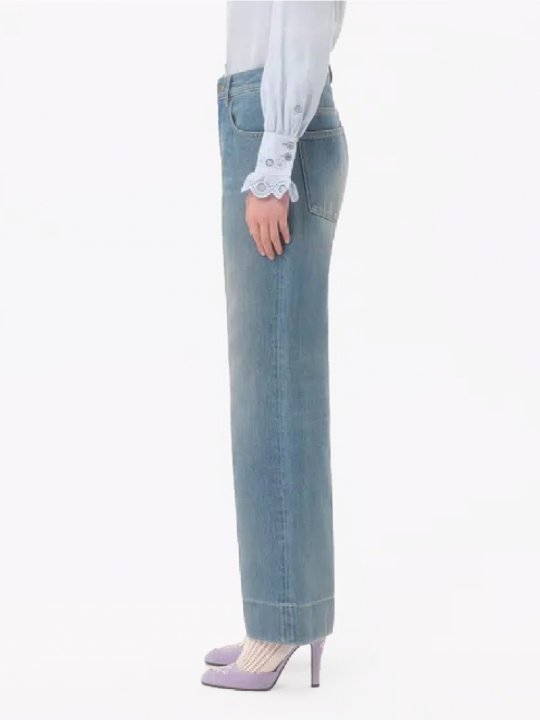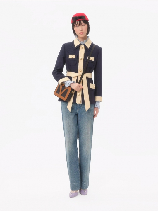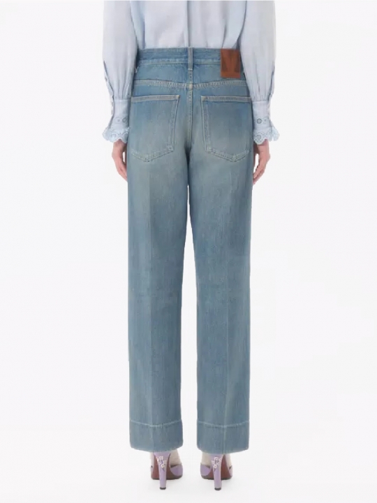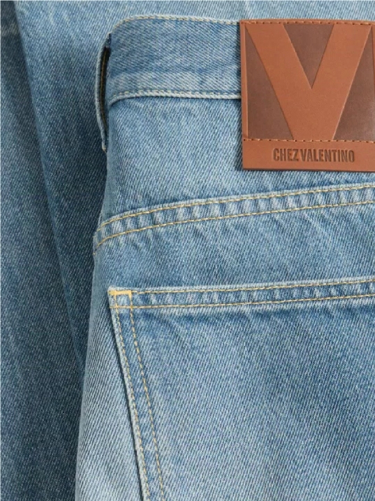 VALENTINO 藍色牛仔褲,附口袋、腰帶環和隱形拉鍊紐帶。 模特兒身高176公分,穿著40號