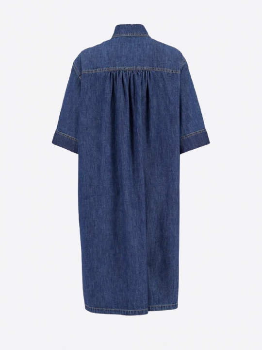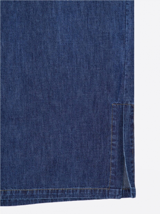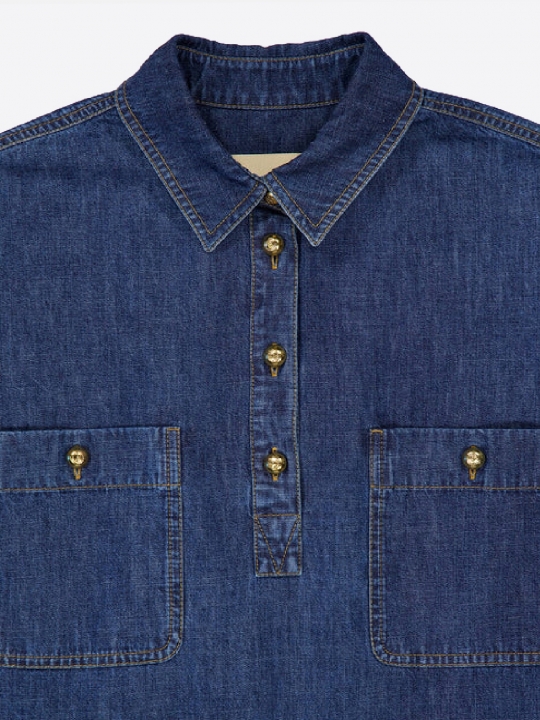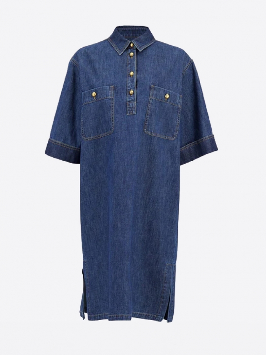 短袖設計,尖領,前襟扣,胸前兩個口袋飾以金色紐帶,低調奢華。 裙擺側開衩,更添靈動之感,挺括的牛仔布料勾勒出現代感十足的輪廓 無論是休閒優雅還是都市時尚,都能輕鬆駕馭。