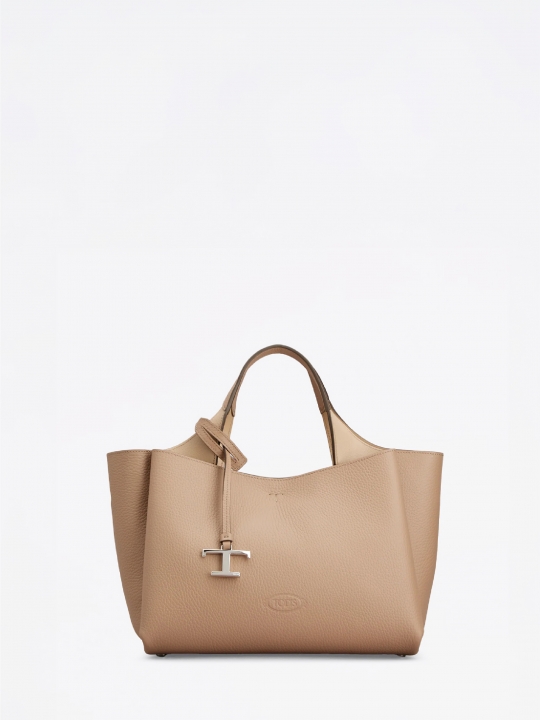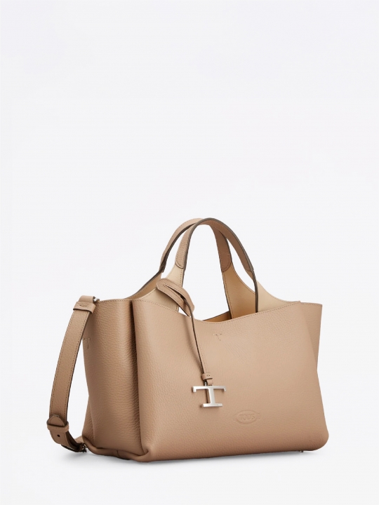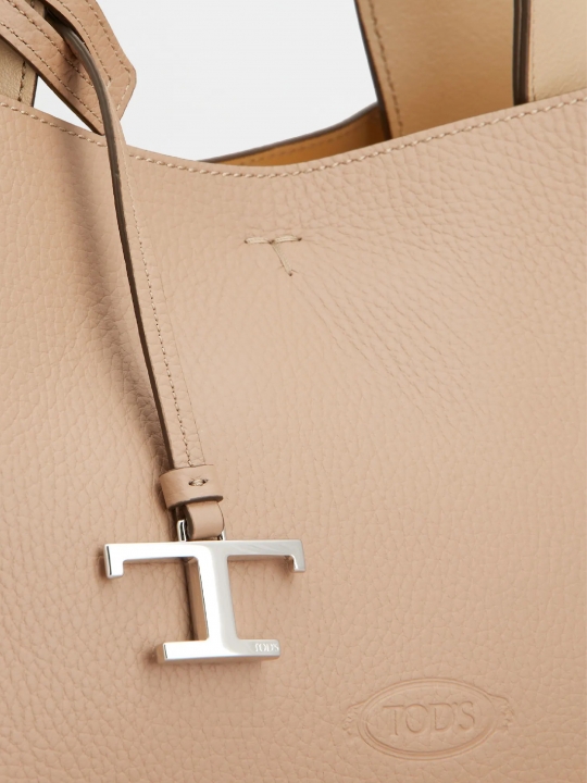 這款手袋以柔軟的粒紋皮革製成,正面點綴Tod's標誌,設有扁平手挽和可拆式肩帶。內部隔層以一個拉鍊口袋一分為二。袋型優雅,點綴品牌標誌性細節元素,如金屬T字吊飾和T字縫線。