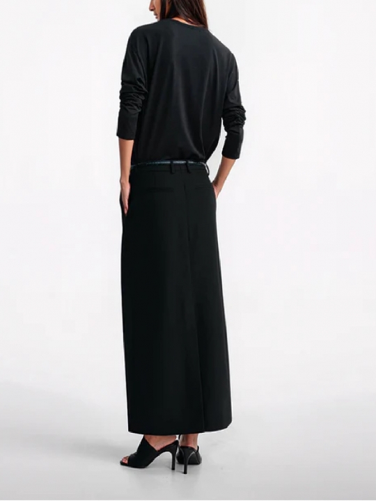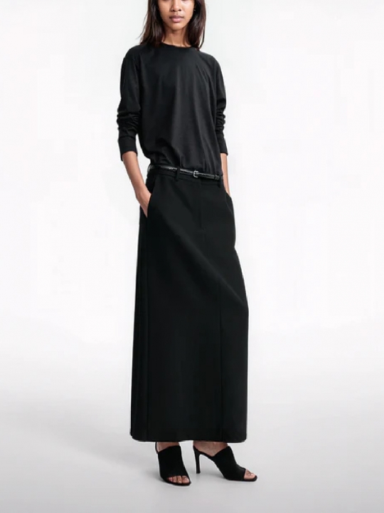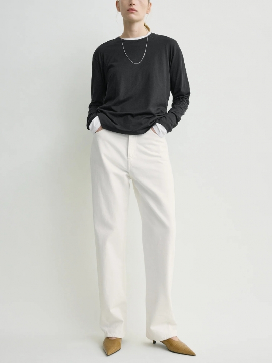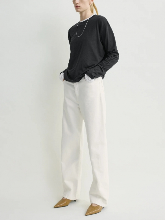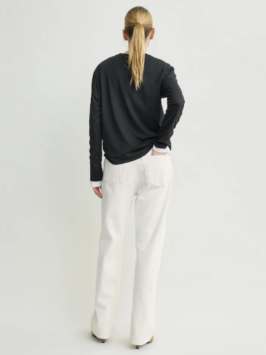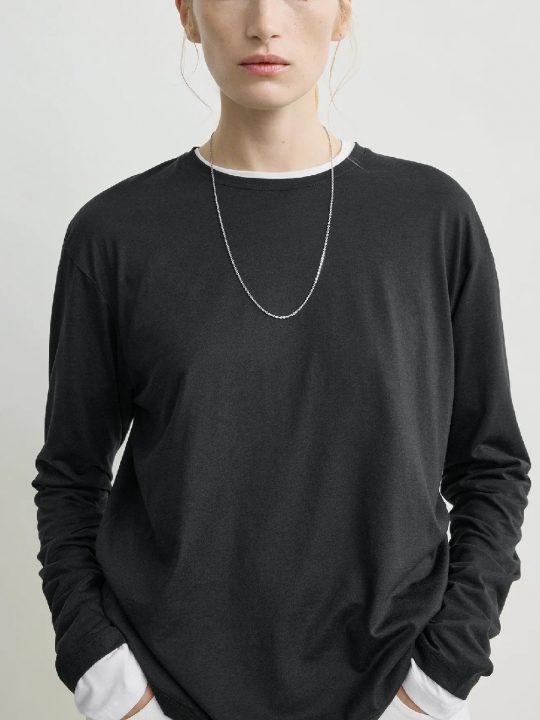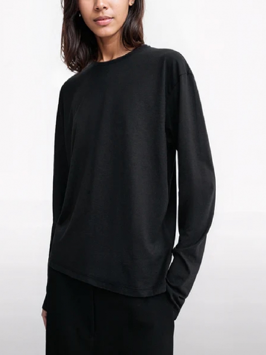 採用黑色精梳棉布料,圓領,落肩長袖,寬鬆版型。觸感格外柔軟輕盈。