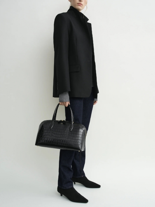 以男士剪裁為靈感。它採用我們標誌性的西裝面料精心打造,廓形寬鬆,並以單顆前扣固定,盡顯簡約魅力。在寬大的翻領內塞入一條絲巾,即可輕鬆展現出正式晚宴的優雅氣質。