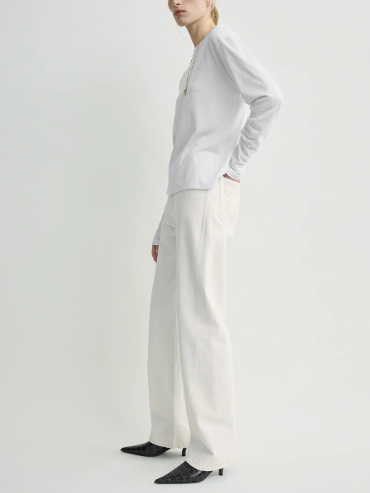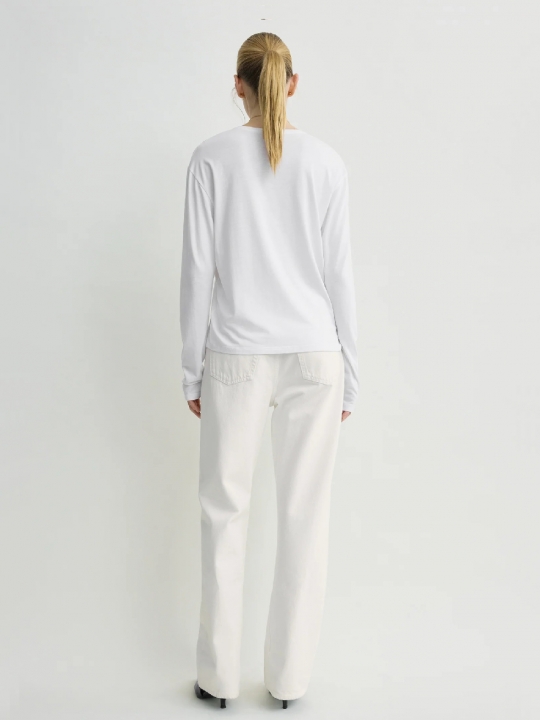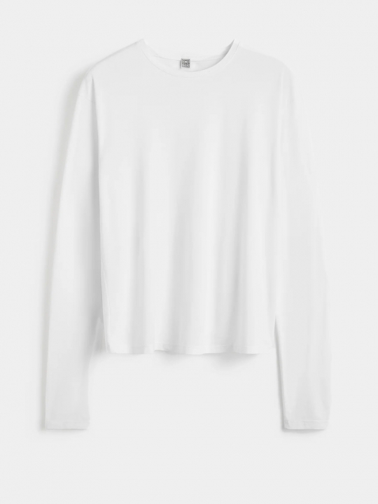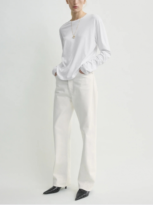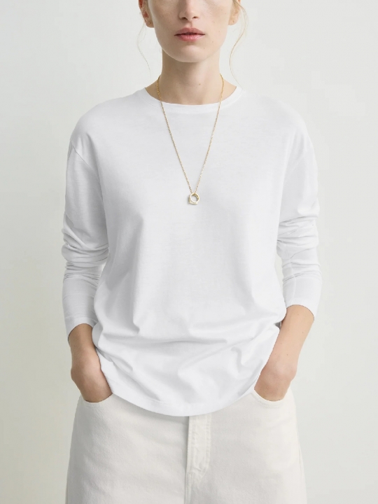 採用白色精梳棉布料,圓領,落肩長袖,寬鬆版型。觸感格外柔軟輕盈。