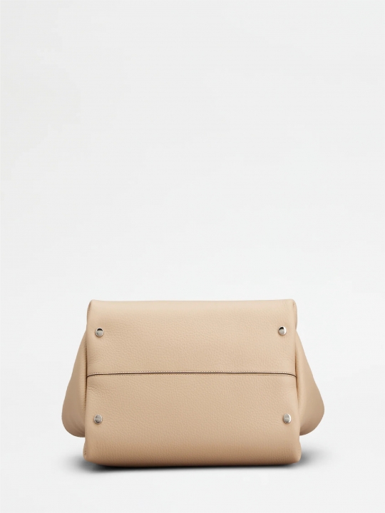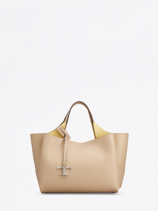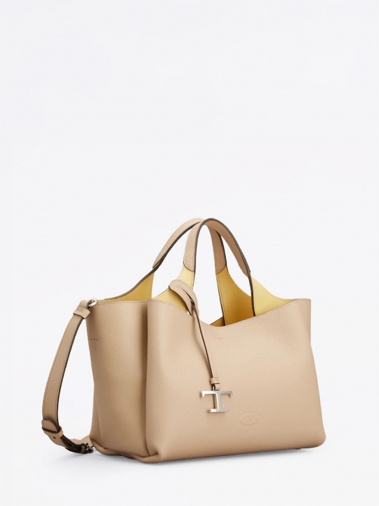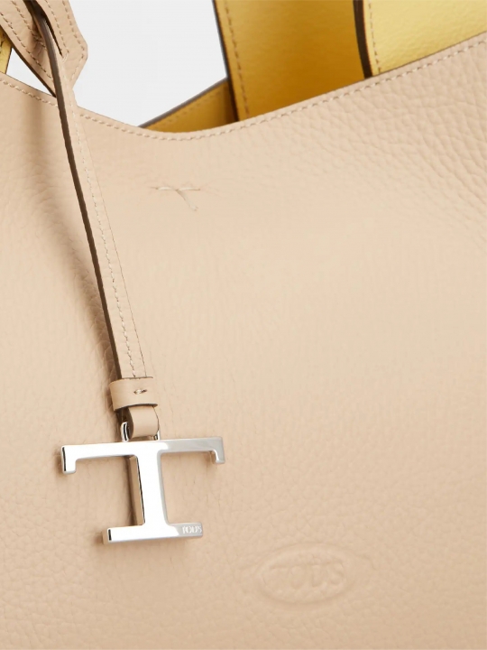 這款手袋以柔軟的粒紋皮革製成,正面點綴Tod's標誌,設有扁平手挽和可拆式肩帶。內部隔層以一個拉鍊口袋一分為二。袋型優雅,點綴品牌標誌性細節元素,如金屬T字吊飾和T字縫線。