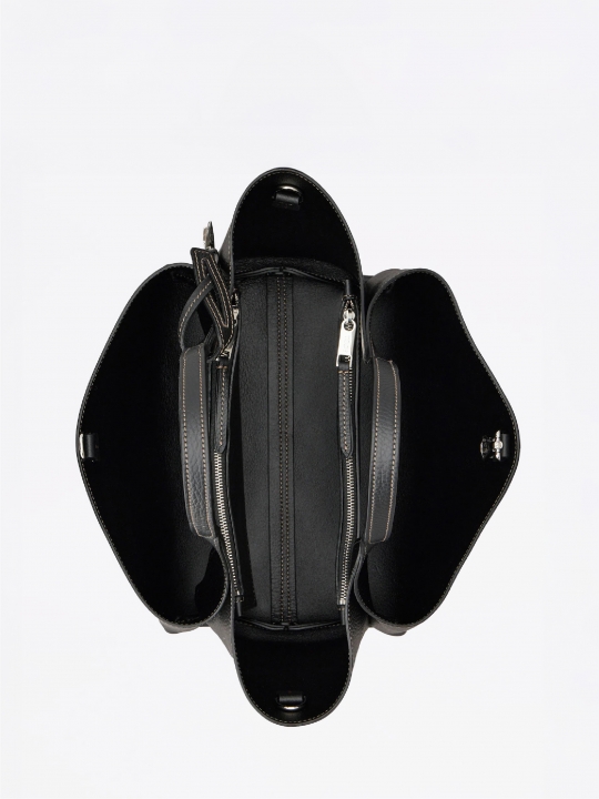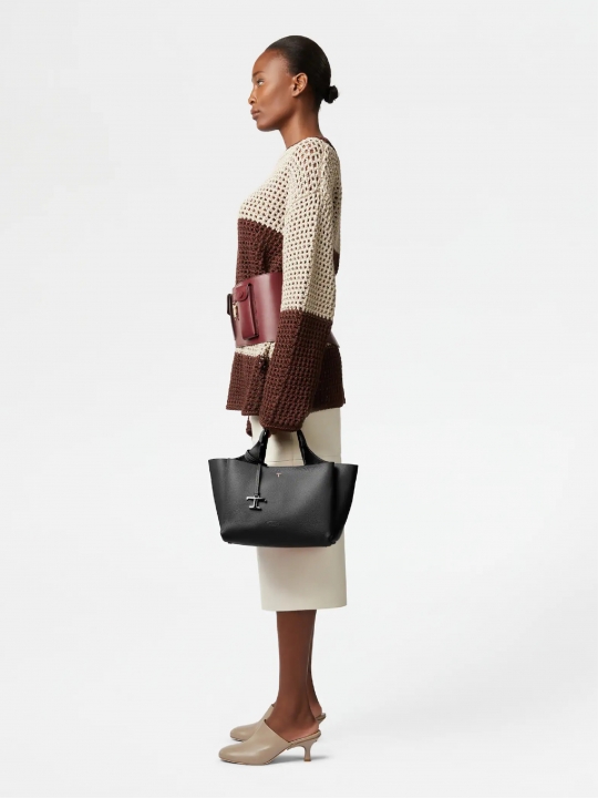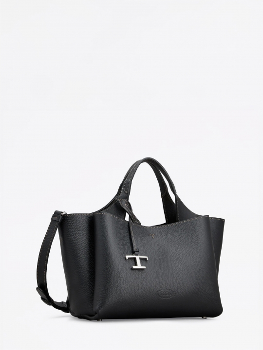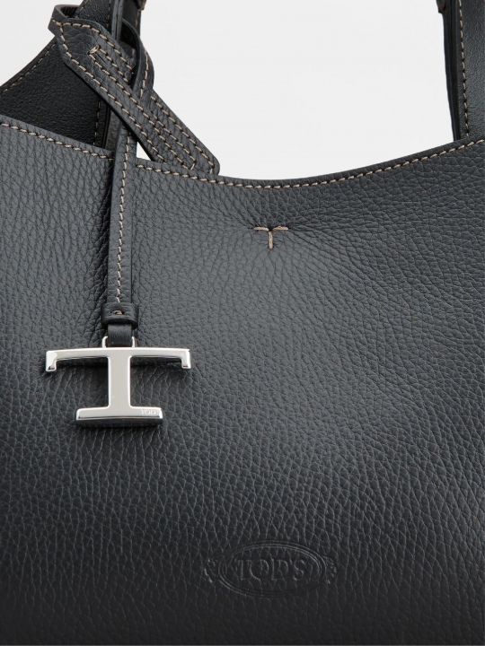 這款手袋以柔軟的粒紋皮革製成,正面點綴Tod's標誌,設有扁平手挽和可拆式肩帶。內部隔層以一個拉鍊口袋一分為二。袋型優雅,點綴品牌標誌性細節元素,如金屬T字吊飾和T字縫線。